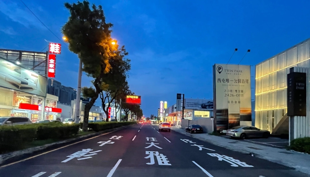 道路的線條在燈光下閃耀,像為城市披上整齊的禮服